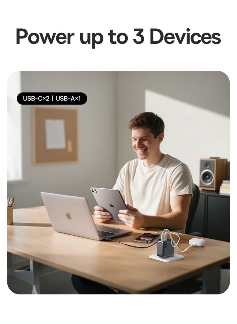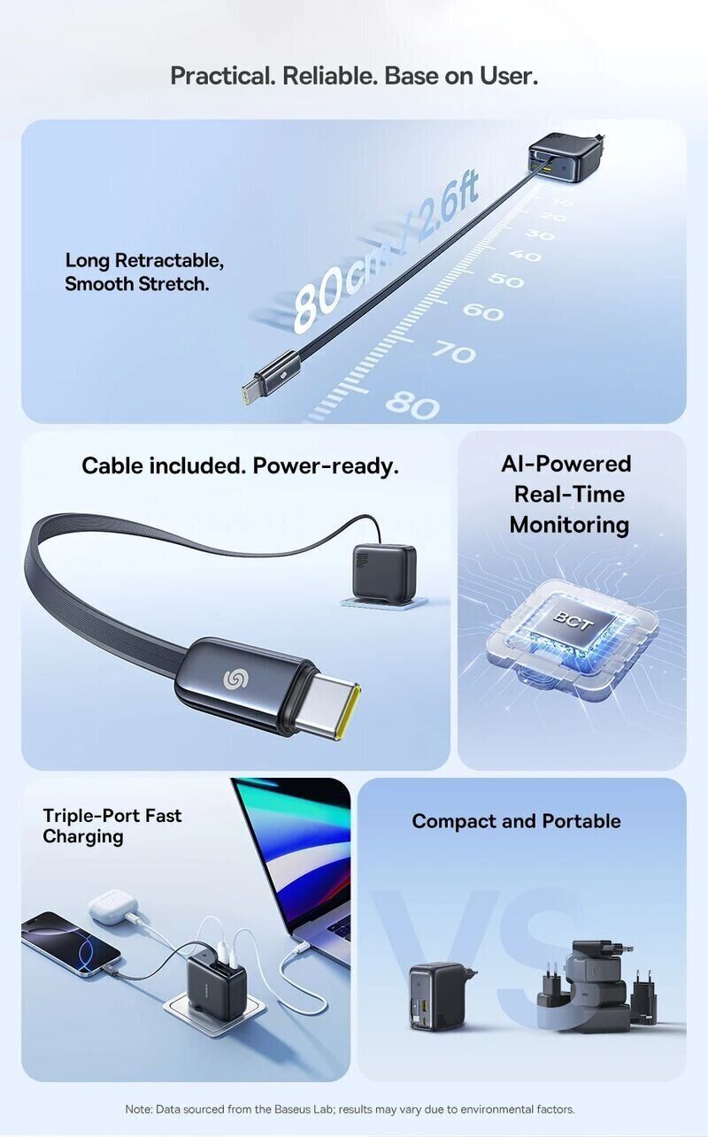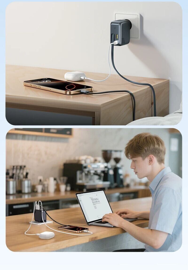 Мережевий зарядний пристрій Baseus EnerCore CJ11 2C+U (100W) + кабель Type-C (E0120M00) — це універсальний адаптер високої потужності, призначений для швидкої зарядки ноутбуків, смартфонів та інших сучасних пристроїв. Завдяки технології GaN пристрій поєднує компактні розміри з високою ефективністю та зниженим нагріванням, що робить його зручним для щоденного використання та подорожей. Вбудований висувний кабель USB-C спрощує підключення та позбавляє від необхідності носити окремі дроти. Додаткові порти дозволяють одночасно заряджати кілька гаджетів без втрати стабільності живлення. Інтелектуальна система управління автоматично підбирає оптимальні параметри зарядки, а вдосконалена система відведення тепла з графеновими елементами допомагає підтримувати стабільну роботу навіть при високому навантаженні.