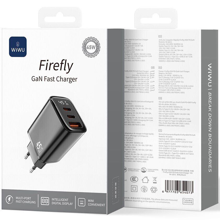 Мережевий зарядний пристрій WIWU Wi-G011 Gan 45W (1U+2C) — універсальний адаптер для швидкої та безпечної зарядки сучасної електроніки вдома, на роботі та в подорожах. Компактний корпус зручно носити з собою, а продумана компоновка портів дозволяє підключати відразу кілька пристроїв без зайвих незручностей. Модель оснащена одним USB-A і двома роз'ємами Type-C, тому підходить для одночасної зарядки смартфона, планшета, навушників та інших гаджетів. Підтримка популярних протоколів швидкої зарядки забезпечує коректний розподіл потужності та оптимальні параметри живлення для кожного підключеного пристрою. GaN-технологія підвищує енергоефективність і допомагає знизити нагрів, зберігаючи стабільну роботу навіть при навантаженні. Цифровий дисплей відображає поточні параметри зарядки в реальному часі, роблячи контроль наочним і зручним.