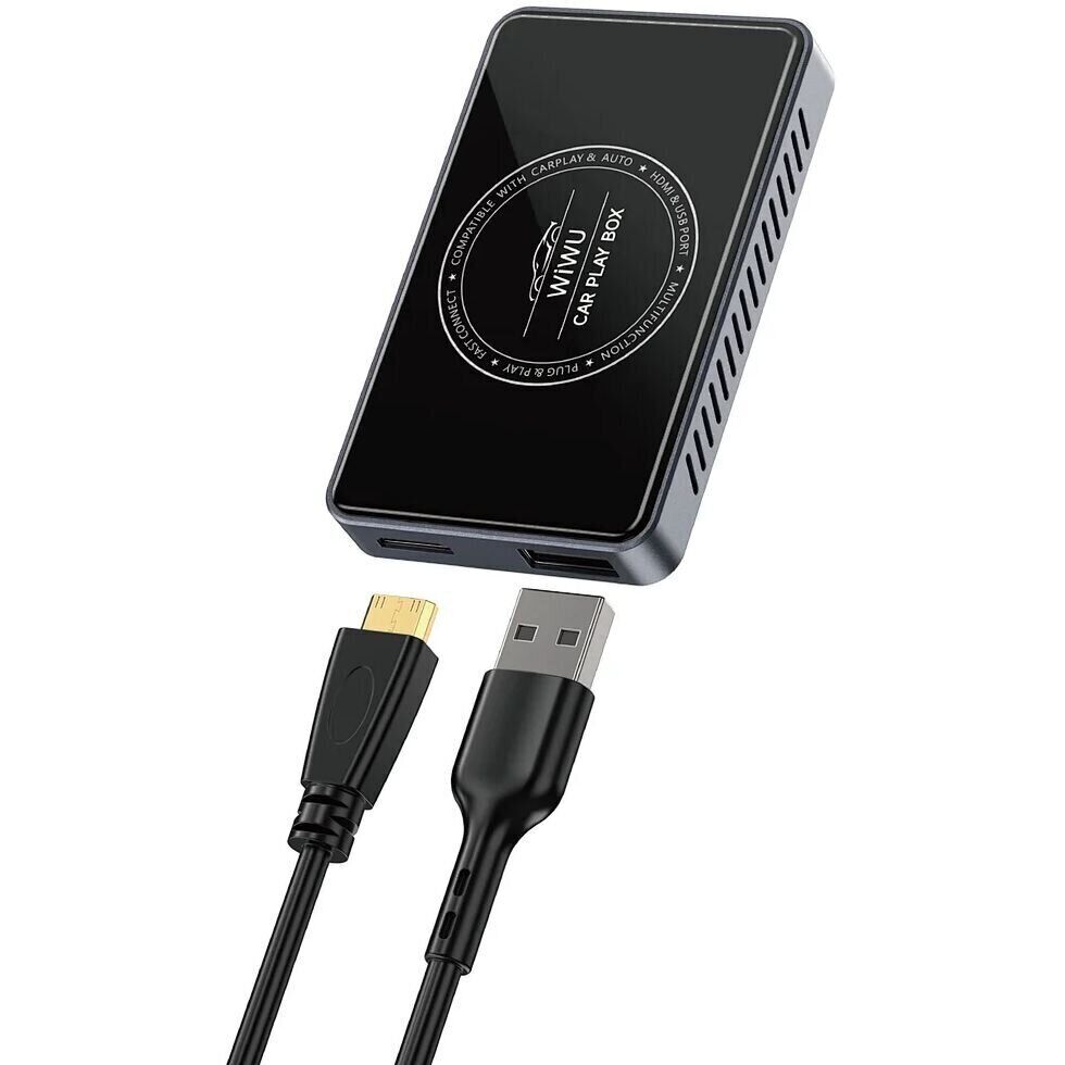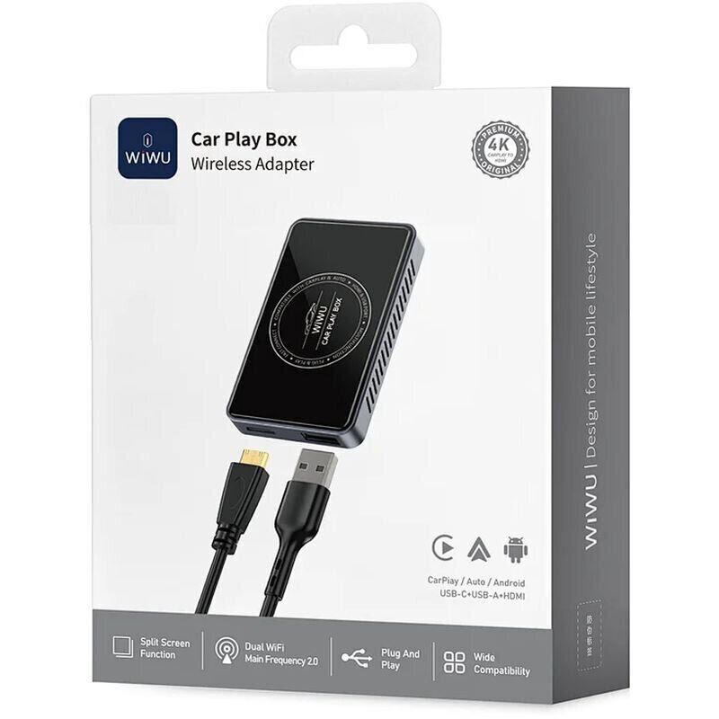 Бездротовий автомобільний адаптер WIWU Wi-CP004 Play Box Car Wireless CarPlay (iOS + Android) — це «розумний» мультимедійний бокс, який перетворює штатну систему автомобіля в гнучкий центр розваг і навігації. Пристрій об'єднує відразу кілька сценаріїв: бездротовий Apple CarPlay для iOS, бездротовий Android Auto для Android і повноцінне Android-середовище, щоб запускати додатки прямо в автомобілі без прив'язки до кабелю. Продуктивна апаратна платформа з чотириядерним процесором розрахована на плавну роботу інтерфейсу і обробку важкого контенту, включаючи декодування відео до 4K, а дводіапазонний Wi-Fi допомагає утримувати стабільне з'єднання для стрімінгу і карт. Вбудований магазин додатків і оновлення «по повітрю» спрощують додавання нових функцій і підтримку актуальності системи. Для розширення можливостей передбачений HDMI-вихід: можна вивести зображення на додатковий екран і розважити пасажирів на задньому ряду, перетворивши поїздку в повноцінний медіа-сеанс. Корпус з анодованого алюмінієвого сплаву і загартованого скла 6H виглядає преміально і добре вписується в інтер'єр.