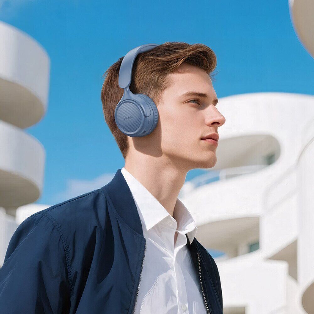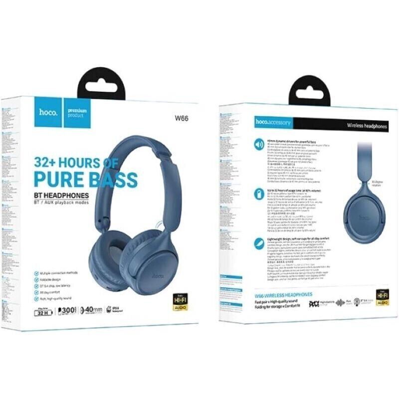 Бездротові навушники Hoco W66 — універсальна модель для щоденного використання, в якій поєднуються сучасний дизайн, надійна конструкція і тривала автономність. Навушники працюють по Bluetooth 5.4, забезпечуючи стабільне підключення і мінімальні затримки при передачі звуку, а при необхідності можуть підключатися по AUX-кабелю для дротового прослуховування. Акумулятор ємністю 300 мА·год забезпечує до 32 годин відтворення, тому модель зручна для поїздок, роботи і активного ритму дня. М'які амбушюри з PU-шкіри комфортно прилягають і допомагають знизити втому при тривалому носінні, а складна конструкція спрощує зберігання і транспортування. Корпус з міцного ABS-пластику доповнений захистом IPX4, завдяки чому навушники стійкі до бризок і поту і підходять для різних умов.