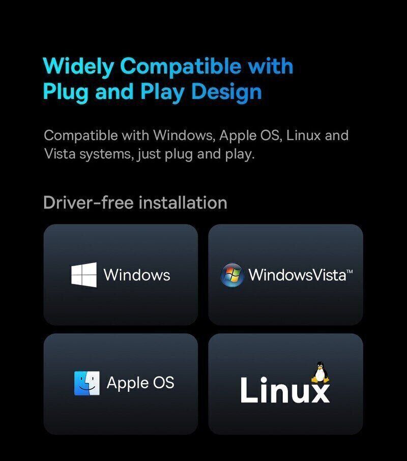 - Plug & Play — подключение без драйверов и лишних настроек;