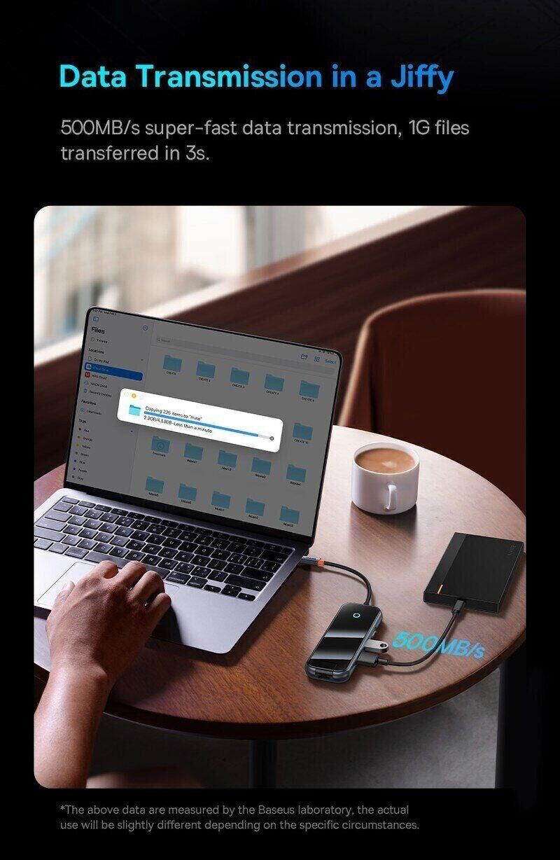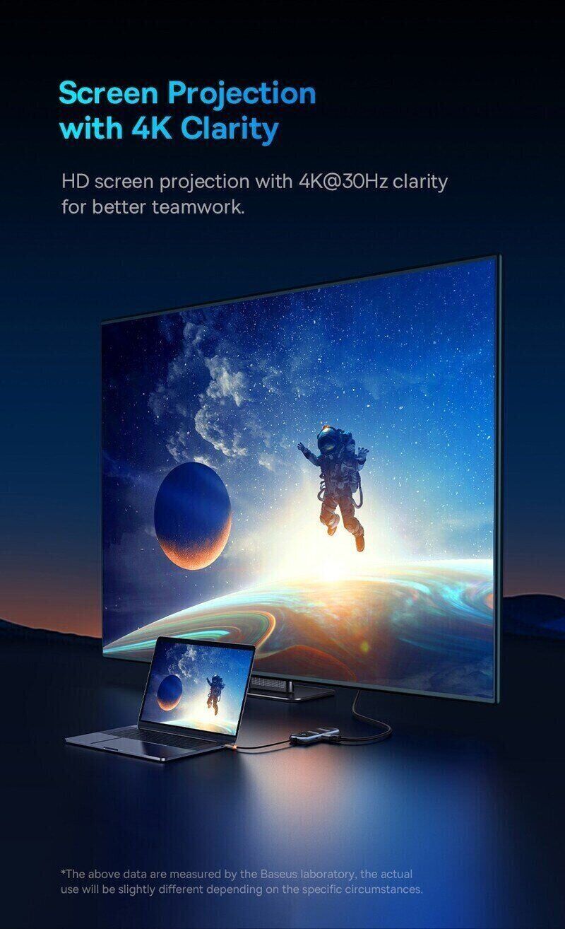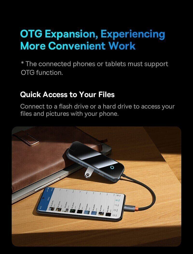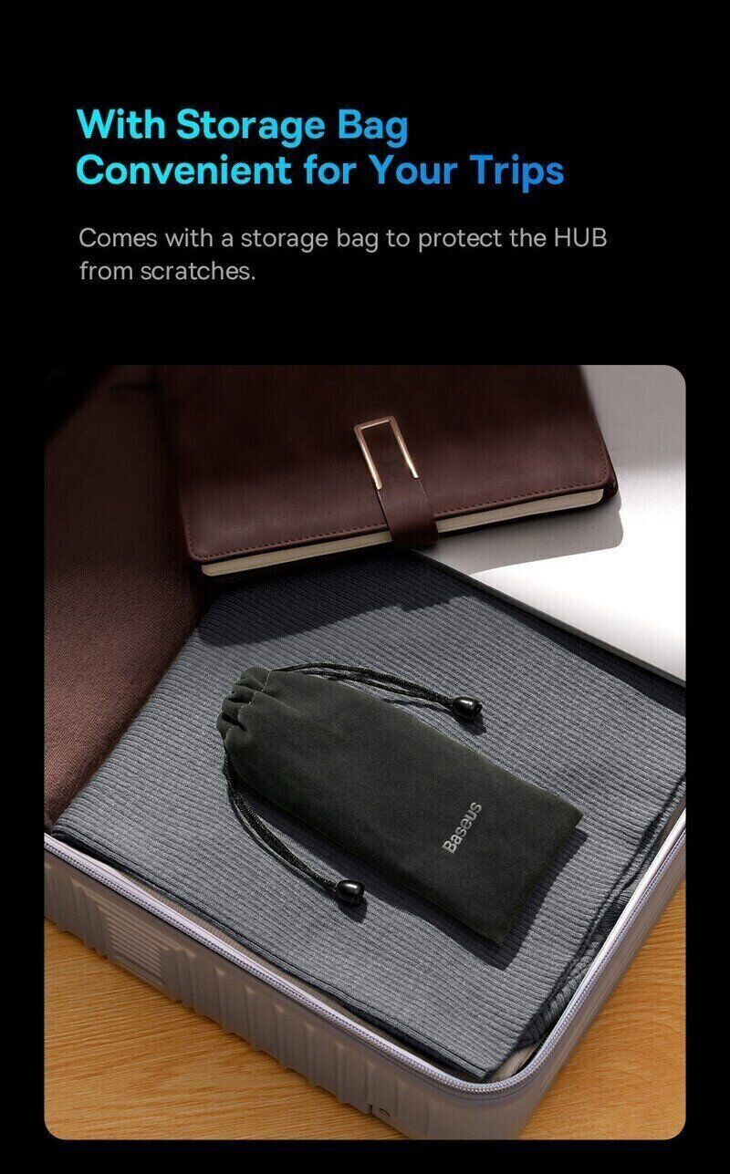 USB HUB Baseus AcmeJoy 5 in 1 (WKJZ010213) — компактный многофункциональный адаптер для ноутбуков, планшетов и смартфонов с разъёмом Type-C, который расширяет набор портов и упрощает подключение периферии. В одном корпусе собраны ключевые интерфейсы для работы и мультимедиа: можно вывести изображение на внешний экран в 4K и параллельно заряжать устройство по Power Delivery до 100 Вт. HDMI с поддержкой 4K@30Hz подходит для подключения монитора или телевизора, а USB 3.0 обеспечивает быструю передачу данных до 5 Гбит/с — удобно для флешек, внешних накопителей, клавиатуры и мыши. Корпус выполнен в современном стиле с глянцевой панелью из закалённого стекла, при этом хаб остаётся лёгким и удобным для поездок. Поддержка Plug & Play позволяет начать работу сразу после подключения без установки драйверов.