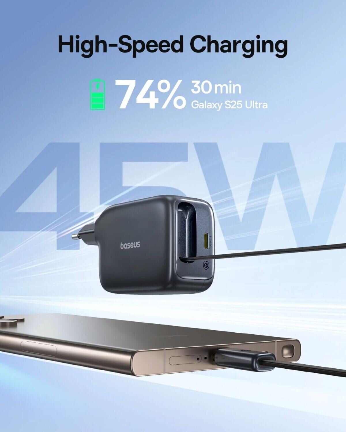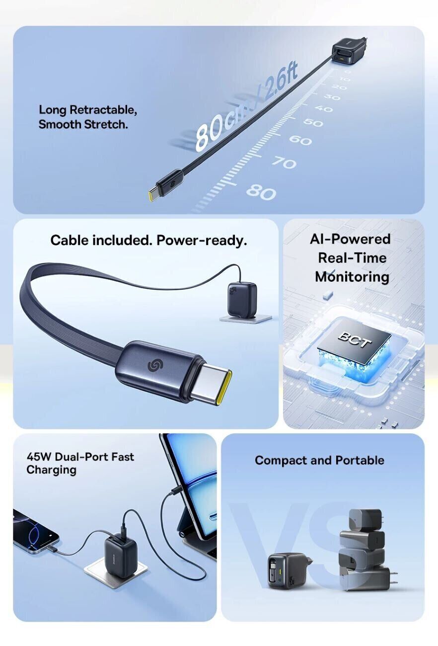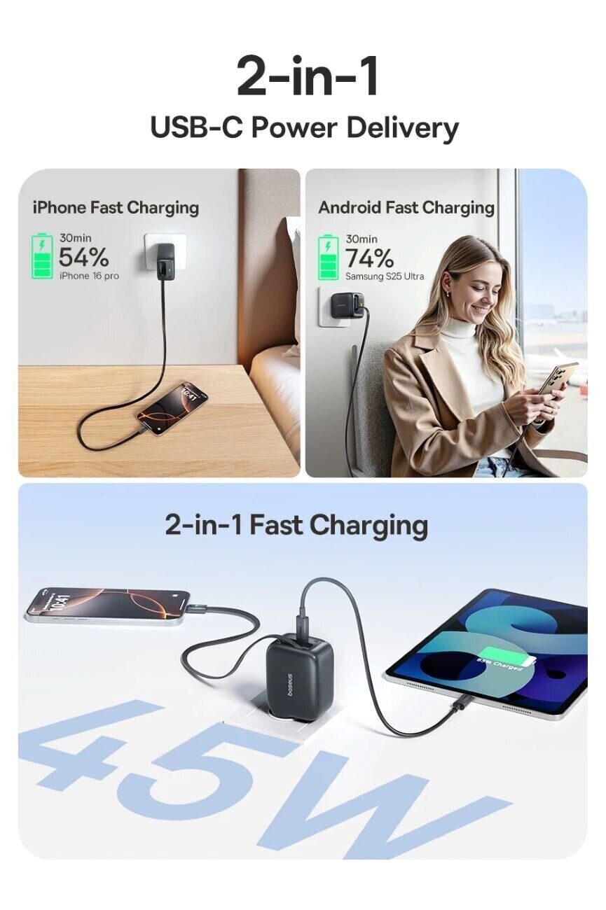 Сетевое зарядное устройство Baseus EnerCore CJ11 2C (45W) + кабель Type-C (E0120G00) — компактный и мощный адаптер для быстрой зарядки устройств Samsung и другой современной техники дома, в офисе и в поездках. Модель выдаёт до 45 Вт и отличается продуманной конструкцией со встроенным вытяжным кабелем USB-C длиной 80 см — можно заряжать смартфон или планшет без дополнительных проводов. Дополнительный USB-C порт расширяет сценарии подключения и помогает одновременно использовать разные кабели. Зарядное устройство автоматически подбирает оптимальные параметры питания для совместимых гаджетов, а GaN-технология повышает энергоэффективность и снижает нагрев при компактных размерах. Корпус из термостойкого поликарбоната рассчитан на ежедневную эксплуатацию и сохраняет надёжность при длительной нагрузке.
