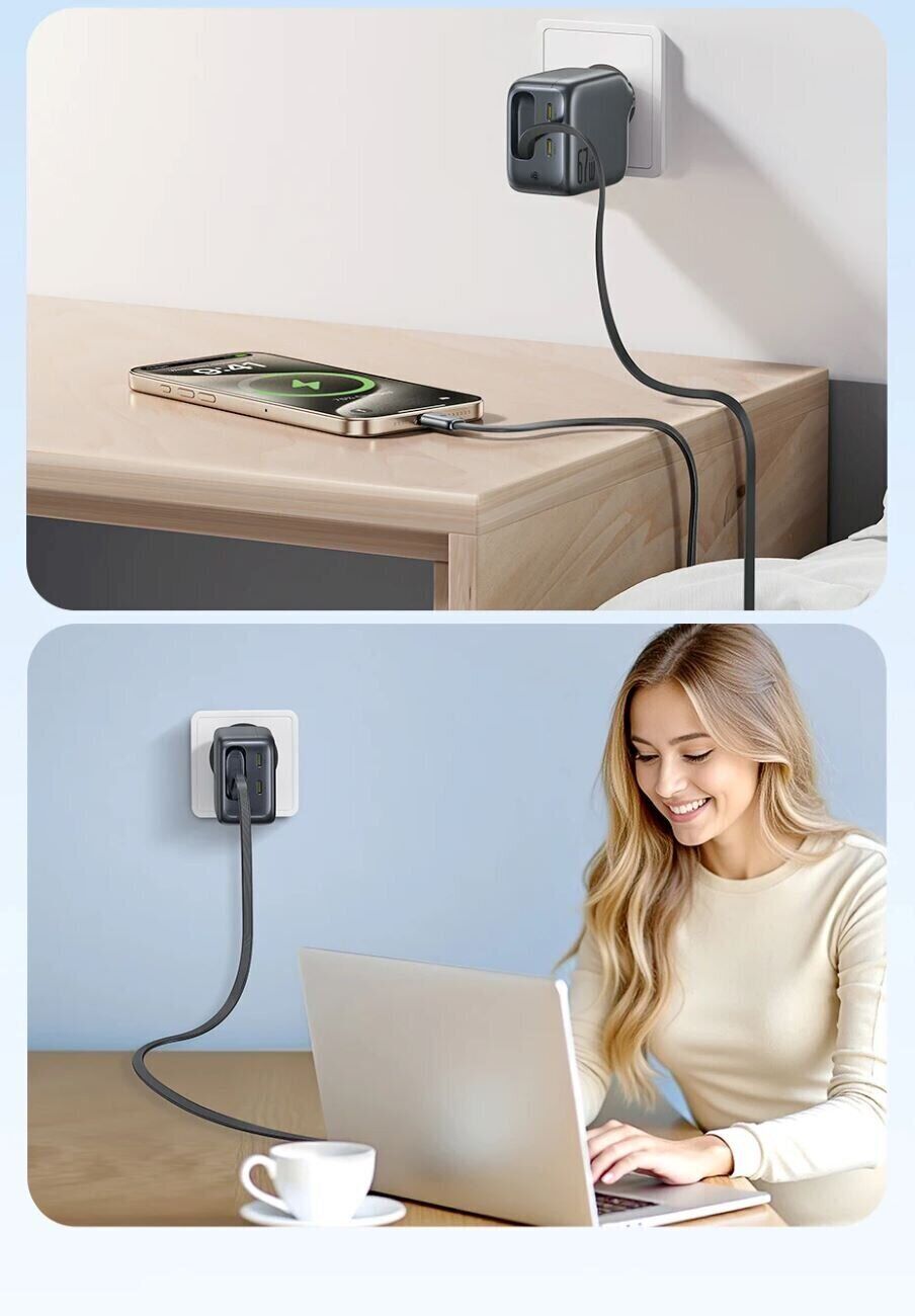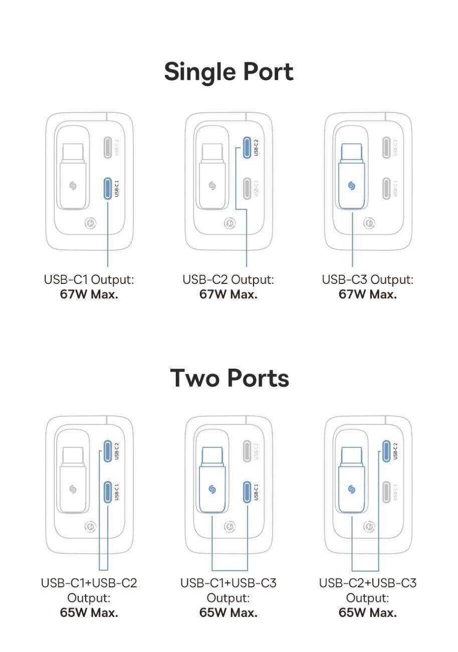 - Мощность до 67 Вт — подходит для быстрой зарядки смартфонов, планшетов и совместимых ноутбуков;