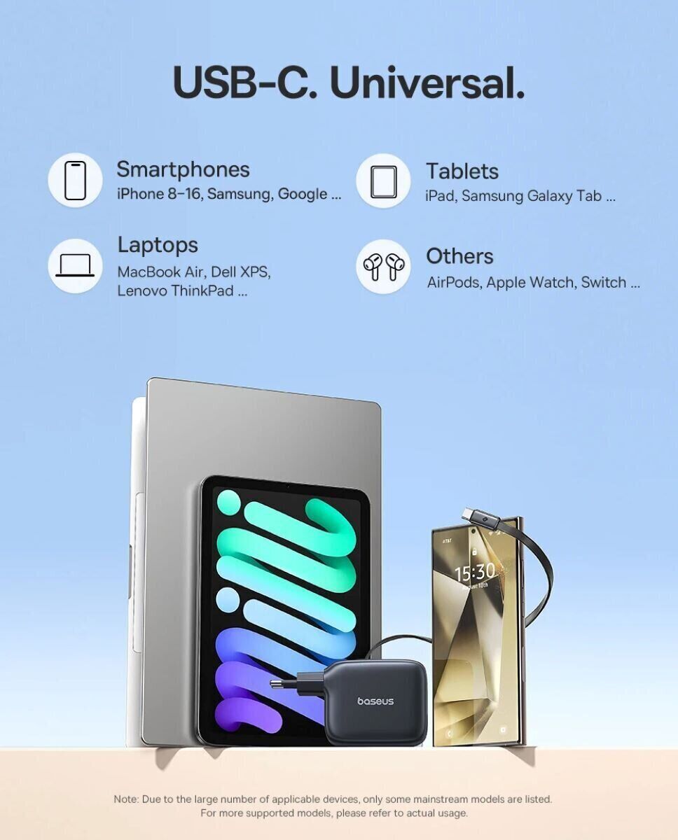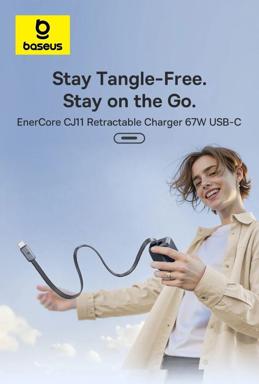 Сетевое зарядное устройство Baseus EnerCore CJ11 3C (67W) + кабель Type-C (E0121E00) — мощный компактный адаптер для быстрой и безопасной зарядки устройств Samsung, планшетов, совместимых ноутбуков и другой техники. Модель выдаёт до 67 Вт и отличается практичной конструкцией со встроенным вытяжным кабелем USB-C длиной 80 см — удобно в поездках и на рабочем месте, когда не хочется носить отдельный провод. Два дополнительных порта USB-C позволяют подключать несколько гаджетов одновременно, сохраняя стабильную подачу питания. GaN-технология повышает эффективность работы, помогает снизить нагрев и делает корпус заметно компактнее. Термостойкий поликарбонат рассчитан на ежедневную эксплуатацию и устойчив к повседневным нагрузкам, а встроенные системы защиты поддерживают корректную зарядку и помогают снизить риски перегрева, перегрузки и короткого замыкания.