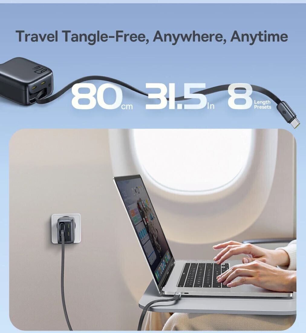 - Три USB-C выхода: 2 порта USB-C плюс встроенный вытяжной USB-C кабель для одновременной зарядки нескольких устройств;