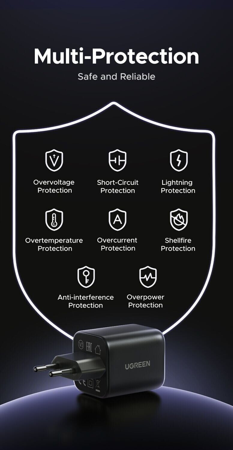 Сетевое зарядное устройство UGREEN X524 GaN 45W Type-C — это компактный и высокопроизводительный адаптер, созданный на базе прогрессивной GaN-технологии. Он сочетает мощность, энергоэффективность и минимальный нагрев, обеспечивая стабильную работу даже при длительной зарядке. Универсальный порт Type-C делает устройство подходящим для смартфонов, планшетов и ноутбуков начального уровня, а поддержка современных протоколов быстрой зарядки гарантирует максимальную совместимость. Малый размер позволяет легко брать зарядку с собой в поездки, а многоуровневая система защиты обеспечивает безопасное использование в любых условиях.