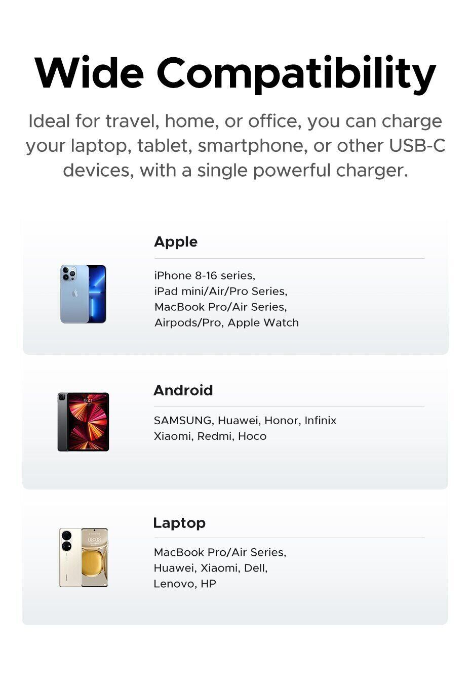 - GaN-технология обеспечивает высокую эффективность, низкий нагрев и компактный размер адаптера;