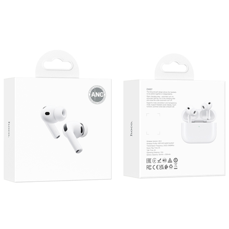 Беспроводные наушники Hoco EW97 – это компактное устройство для прослушивания музыки и общения без использования кабелей, сочетающее практичность и удобство в различных ситуациях. Модель выполнена в формате вкладышей с продуманной формой, благодаря чему наушники удобно размещаются в ушах и не вызывают выраженного давления при длительном ношении. Соединение осуществляется посредством Bluetooth, что обеспечивает стабильную передачу сигнала и совместимость с широким спектром современных смартфонов, планшетов и других гаджетов. Встроенные микрофоны позволяют использовать наушники для разговоров и онлайн-коммуникации, передавая голос без необходимости держать устройство в руках. Управление воспроизведением, переключением композиций и ответами на звонки реализовано через сенсорные элементы, упрощая взаимодействие с устройством. Зарядный кейс выполняет функцию хранения и пополнения заряда, поддерживая несколько циклов подзарядки и обеспечивая удобство при переноске. Корпус изготовлен из пластика с гладкой поверхностью, которая легко очищается и сохраняет аккуратный внешний вид. Конструкция кейса предусматривает надёжную фиксацию наушников внутри, а также наличие разъёма для подключения зарядного кабеля.
